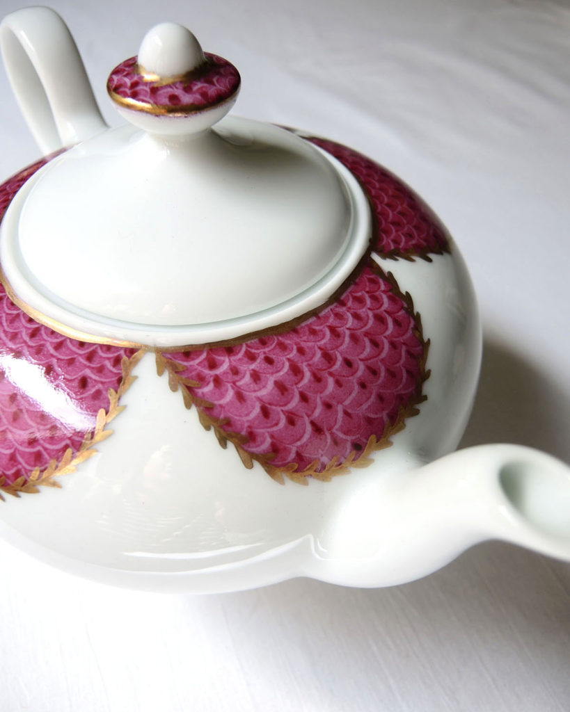 Textures – Théière ‘écaillée’ – Théière à motif écaillé avec filet en or : 80€ – Design abstrait – Vase en platine : 80€ Vide poches : 65€